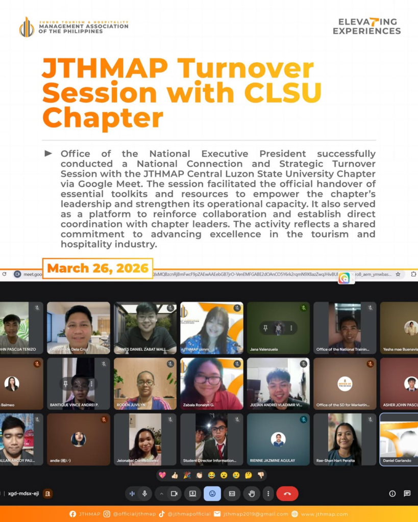 With the participation of JTHMAP National Offices, CLSU students, and advisers, the session also reinforced collaboration and established direct coordination, reflecting a shared commitment to advancing excellence in the tourism and hospitality industry.