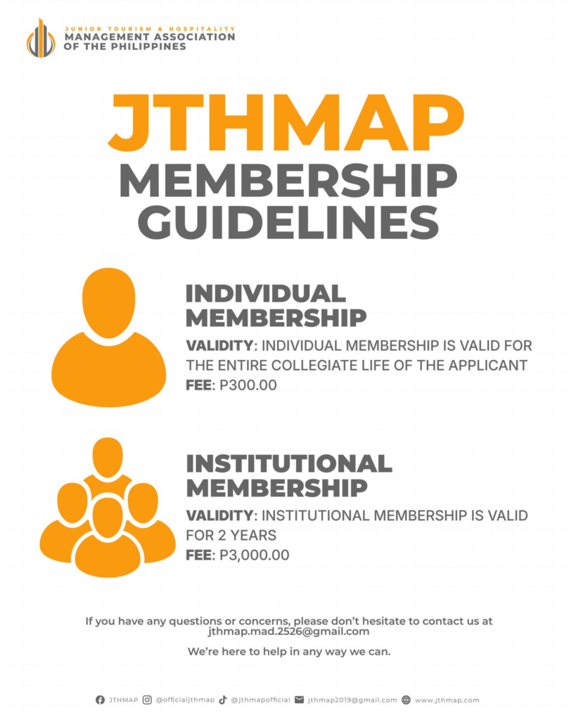 Thank you for expressing interest in joining Junior Tourism and Hospitality Association of the Philippines. Listed below what you need to know about our membership process. Should you need further assistance, please do not hesitate to send us a message.